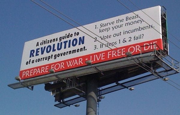 The "Lafayette County Republican Central Committee" of Missouri -- an evil power of greater strength than the Chamber of Commerce and AHIP and Jackie Seal combined, times Halloween -- has posted this warning on the highway: when the Second Revolutionary War comes... get your ass to New Hampshire and hide, because war is really scary! [ Fired Up! Missouri via Oliver Willis ]