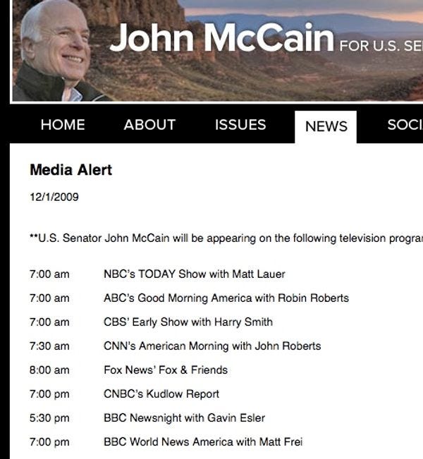 Judging from how hard television producers have already worked to book John McCain on their shows this year, to discuss topics he doesn't give a flying fuck about, like health care or domestic policy in general or really anything non-deathbomby, he will now probably be on most television shows at all times for the next week or so to discuss his figurehead (Very Serious) role in determining Afghanistan strategy. He even has three programs left today -- yeah, that's right England, you have to put up with this shit too; he's coming to bomb your "telly" at 19: 00 Royal Queen's Time. And don't be surprised if he shows up on tomorrow's episode ofFriends, or whatever the top programs are these days. [ John McCain via No More Mister Nice Guy / Balloon Juice ]