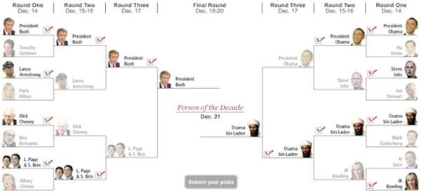 Ha! We have only just discovered the awesomeness that is thisWashington Post"Person of the Decade" Tournament, which has now been pared down to two finalists: George W. Bush and Osama bin Laden. Osama bin Laden beat Barack Obama in the semi-finals! What a surreal, hilarious sentence that was to write, for reasons as yet unclear. But yeah, George W. Bush, Osama bin Laden. It's so terrifyingly accurate. And both are still at large. Have a drink, America. [ Washington Post via Matt Yglesias ]
