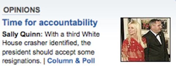 If you read ONLY ONE important (for national security)Washington Postcolumn today, let it be this divine half-drunk prattling from Queen and Spokeswoman of the Washington Premier Socialite Village Lawn Party Country Club, Sally Quinn. Good Heavens! Amazing how offended the comfortably rich and connected 150-year landed gentry of this temporal, diamond-shaped government office park get when three NINNIES briefly puncture their esteemed bubble.