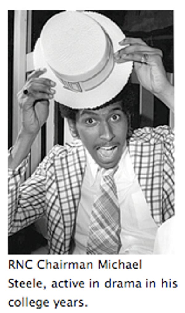 Think Progress wrote a news story about Tea Party something, presumably Michael Steele-related but who knows, and in the process, unearthed the Greatest Photo and Caption of Our Time or Any Other: It is of Michael Steele's lapels wearing a very fresh-faced Michael Steele. The Internet has not seen archival research of this sort since Meghan McCain learned about Google filters . [ Think Progress ]