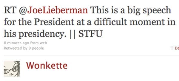 Are you DRUNK YET YOU DRUNKS? Your Wonkette is drinking a 40! Oh wait, those are just two "24s"... which means... 32 ounces less beer, total. Hooray! Well let's tune in to CNN and MSNBC and see how long it takes us to get through these. We'll have new liveblogs every half-hour or so tonight, with a fair bit of Twatting. Here are the rules to your 2010 SOTU Drinking Game, which sacrificed plausibility for the sake of humor. Just kidding, it's plausible. Hope!