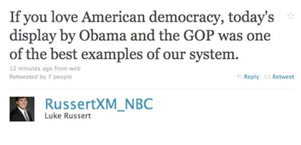 While you people were quick to declare today's Baltimore Blabfest (our alliterative powers suck right now, please help?) to be the greatest moment in Obama history and a righteous victory for truth and Hope etc., we refused to make any verdicts before reading what flush-faced Buffalo dauphin Luke Russert had to say, on Twitter.