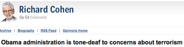 TenuredWashington Postoxygen-consumer Richard Cohen, the World's Worst Writer, has constructed another hilarious screed about Terrorism from the chunks of waste that have long lingered in his adult diaper. At least that's our guess! We gave this one the ol' "blogger read," where you scan the opening paragraph somewhat closely for hilarity and then just read every other topic sentence until it's over, it'sfinallyover, and you can start typing. Here's a blockquote of the opening paragraph: