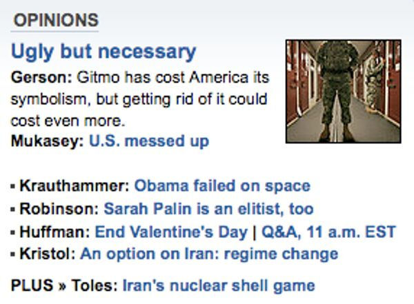 Let's run through it: Michael Gerson thinks Obama is a fag; Michael Mukasey thinks Obama is a fag; Charles Krauthammer has literally written a column that is teased, "Obama failed on space," because he thinks Obama is a fag, about space; Eugene Robinson chimes in with the trenchant observation that Sarah Palin is hypocritical; "Huffman" wants to end Valentine's Day, so thanks for that, Huffman; Bill Kristol thinks Obama is a fag; and Tom Toles drew a picture about why Bill Kristol thinks Obama is a fag.