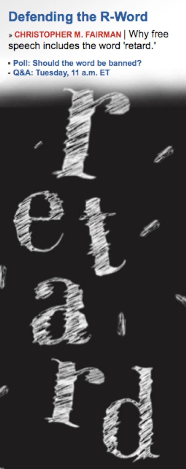 Okay, got it: for the pro-retard, bring out the ol' eternally-missing-the-point stock column, "[This word], too, is protected under Free Speech." The word in this case will be "retard." If "retard" is a word (presumptuous?), and we are allowed to say any word, because of the Constitution, then what are people so worked up about?