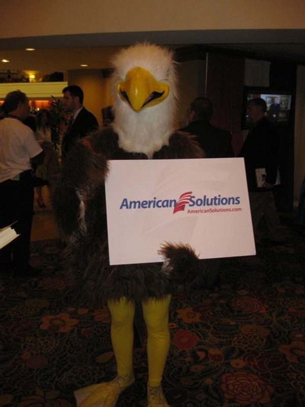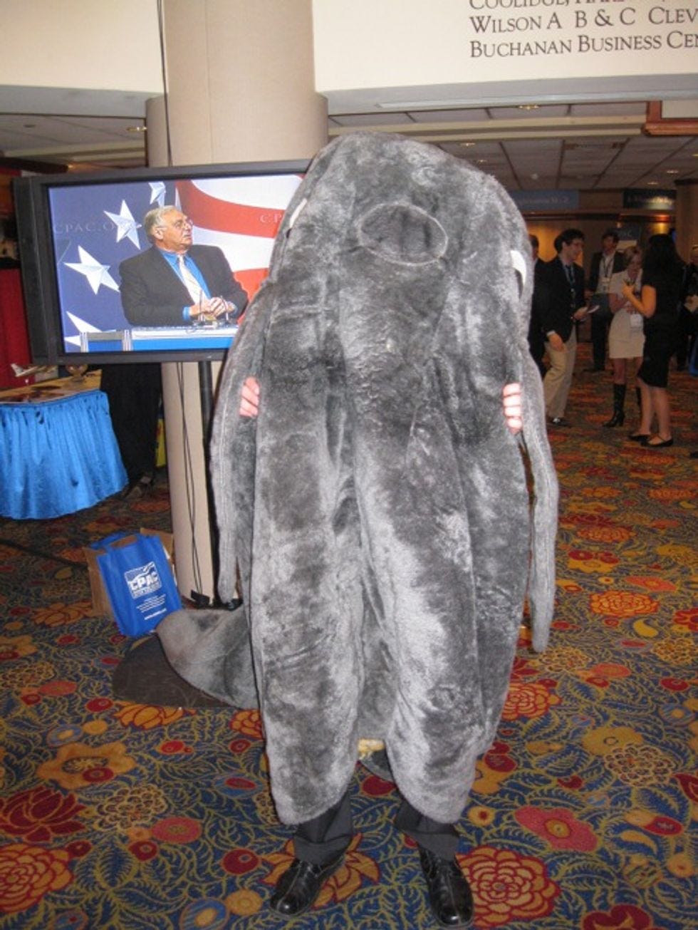 Wonkette's annual CPAC attendee friend Garrett Quinn, who is insane for still going to these things but great for sending us the laffs, has delivered the first batch of terrifying furry photos from Day One. They depict an astroturfing eagle and a monstrous grey squid-elephant walrus fetus thatisn'tDick Armey. (Maybe.) Six demerits to each from Mittens, we guess?UPDATE: My god, is it actuallyCthulhu??