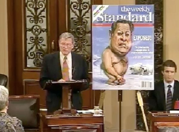 Oil company employee Sen. Jim Inhofe will go further than most to mock Al Gore, whether it's by flying to Copenhagen to yell "suck it Gore" or forcing his enslaved grandchildren to build Gore an igloo, out of SNOW -- HEY-O! -- for his lonely death. Now Inhofe is showing some gay Bill Kristol fever dream of Al Gore's cock on the Senate floor. Suck it Gore! [ Huffington Post ]