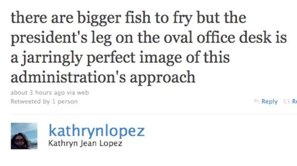 Months later, the wingnuts finally got around to forwarding their "getcher feet offa mah Merkin desk, Obama bin Lyin', its from Queen Vic dagnabbit" email toNational Reviewabortion dragon Kathryn Jean Lopez. Since K-Lo Does Not Read Wonkette, someone should forward her that Bush picture, and then maybe she'd shut up and return to life on Planet Earth. [ Twitter ]