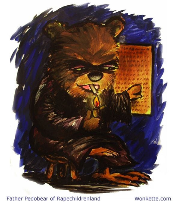 An artist who wishes to remain anonymous has painted this very fancy painting just for your Wonkette, as an upgraded version of the standard Pedobear, copies of whom are spreading throughout Italy as a means of calling the Pope a disgusting Nazi sex monster. We will call him Father Pedobear of Rapechildrenland, and you should plaster his image on the spires of your nearest Catholic church, for laffs. Thank you, very generous anonymous artist!
