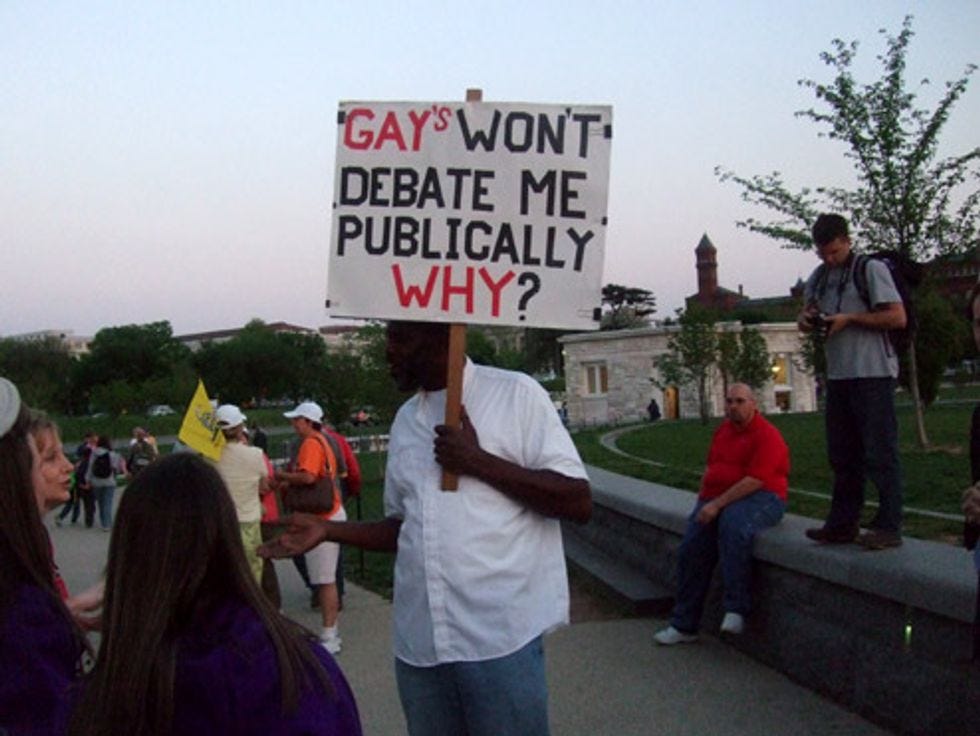 Thanks to Wonkette operative "Jonathan R." for snapping this dapper slob protesting at the Washington Monument yesterday. What's his beef? THE GAYS. Why won't they "debate him" no matter how many times he asks, in public (restrooms), for debating reasons?
