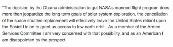 Congressman Todd Akin of Missouri is kind of stupid and we can prove it. In a very serious press release titled "Akin Against Ceding Low Earth Orbit Capabilities to Russians," Akin (meaning his communications person, but let's pick on the top guy anyway) writes: "The decision by the Obama administration to gut NASA’s manned flight program does more than jeopardize the long term goals of solar system exploration, the cancellation of the space shuttles replacement will effectively leave the United States reliant upon the Russian Federation to grant us access to low earth orbit. As a member of the Armed Services Committee I am very concerned with that possibility, and as an American I am disappointed by the prospect." USA! USA! ONE PECULIAR TIDBIT, however: when this release came out yesterday , it didn't say "Russian Federation."