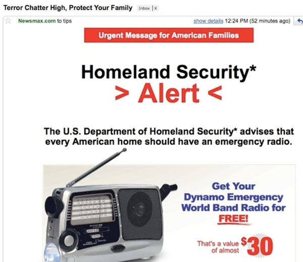 Conservative granny-porn outlet Newsmax has discovered the greatest technological device ever conceived and would like to give it to you for free, because the terrorists are coming, and how else are you going to listen to Rush Limbaugh for crucial security updates from your family's burrowed hole in the backyard? Just crank this gizmo a few times, one two three, just like that. You're welcome. Newsmax will return in the near future with even more products from its Comically Indiscreet Attempts To Exploit Stupid Peoples' Fears line of broken children's toys.