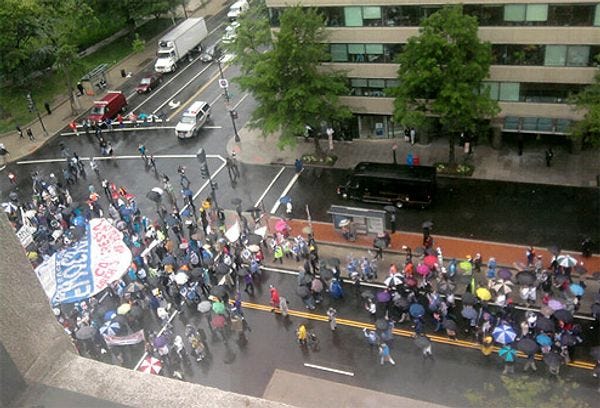 Wonkette Sky-Chopper-One pilot and operative "Trey K." sends us this live view of 14th and K NW, where maybe a couple of hundred of MoveOn/Anti-Capitalism protesters are demanding legislative changes to the financial reform bills. Can you feel the excitement? No? That's because it began raining and they all fled like rats. NOT VERY HARDCORE.