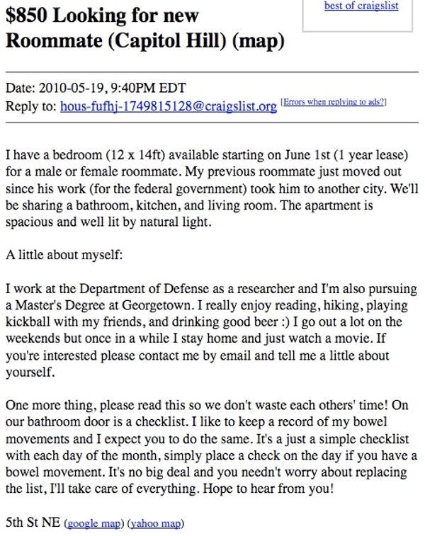 In today's edition of Wonkette Real Estate Prospects For Summertime Workers, we have this room available for rent in DC's lovely Capitol Hill neighborhood. Your roommate would tell you about all the hottest Defense Department gossip, take you to the blandest fun spots in town, and also MAINTAIN A WRITTEN RECORD OF YOUR SHIT. [ Consumerist via Metroblogging DC ]