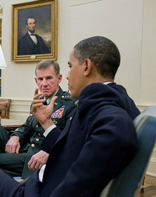 UPDATE: MCCHRYSTAL IS FIRED. PETRAEUS REPLACES HIM.If George Washington was still commander in chief, Stanley McChrystal would be swinging from the gallows today. But no, we've got Barack Obama, who has to havescheduled meetingswith everybody, while John Adams seethes in the hallway. And any moment now, Obama will step out to tell the world the fate of America's Biggest Asshole, Stanley McChrystal, who already left the White House after a half-hour meeting in which the two men discussed such matters as "WHAT IN THE HELL IS WRONG WITH YOU JESUS CHRIST ARE YOU BRAIN DAMAGED? DID A SHELL LAND ON YOUR REDNECK SKULL?"