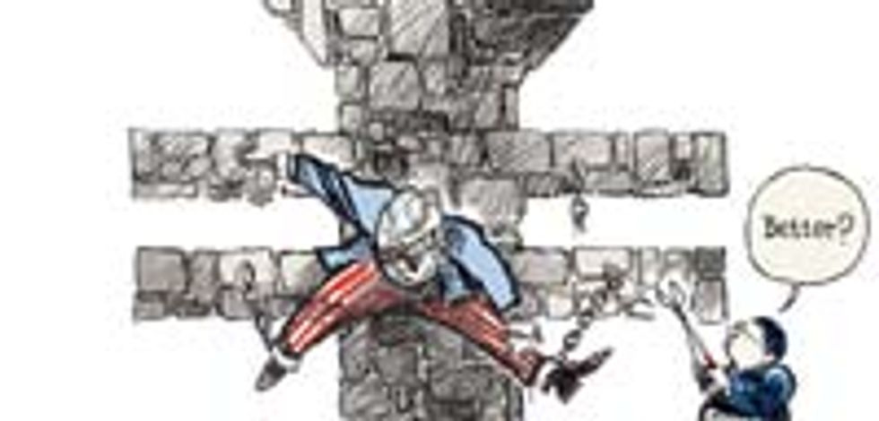 Even some of the Foreigns got in on the sexy action. At some point late in the evening, Uncle Sam and China went downstairs to the makeshift basement S&M dungeon, where our friend from the East showed off his own trademark variation on the St. Andrew's Cross. Have fun, fellas! Don't forget the safe-phrase: "Hold the yuan's overall value steady against a basket of currencies."