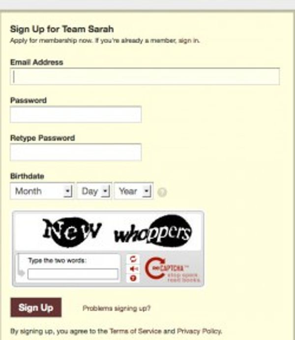 Your Wonkette just tried to sign up for TeamSarah.org, to learn more about "American values in action" and make some new friends, and the sign-up page told us to type in the words "new whoppers" to make the anti-spam captcha thingie Go Boom.