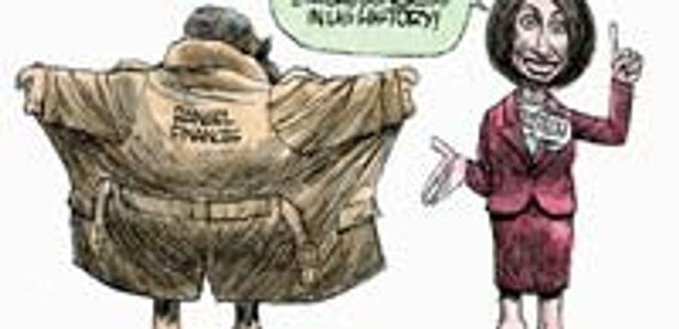 No, to see a real demon, you have to go to the bowels of hell itself. That's where Cartoon Violence's beloved Jeff Danzinger has taken us, and George Steinbrenner. As you can see in the Slate Cartoon Box "In Remembrance" category, political cartoonists are usually reluctant to condemn the prominent recently-deceased to eternal torment, for fear of "offending their families" or some crap like that; thus, loathsome people are routinely being shown glad-handing with St. Peter, suffering at worst some mild razzing (OH SNAP GEORGE STEINBRENNER ST. PETE IS A RED SOX FAN HAW HAW)! But Danzinger clearly thinks that if it's good enough for God, it's good enough for him, and kudos to him for it!