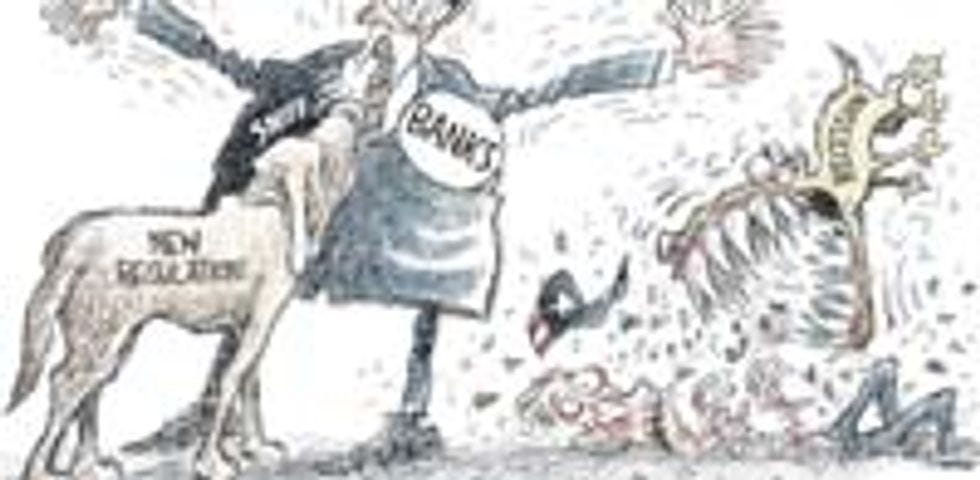 It is important that hobos be given sign-holding duties, because otherwise they will have two hands free to indulge in their usual vice: opening up their tattered trench coat so as to expose their genitals to ladies. This is "unethical" because Congressional ethics guidelines dictate that genitals only be exposed in the context of a loving and mutually consensual relationship, and only after someone has bought someone else dinner. Plus trench-coat-wearing perverts are fun to draw, and things that are fun to draw are good metaphors for, you know, whatever!
