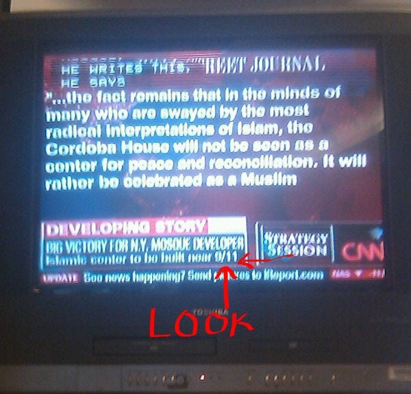 Your Wonkette sold her teevee to buy new Blingee features and also send $$ to SarahPAC, so she can't watch the motion-picture news anymore on an actual TrueTube. But a helpful tipster sent this picture of their own teevee broadcasting a CNN news reel, with very interesting information in the "DEVELOPING STORY" box: Apparently, Manhattan's new Cordoba House/ Islamic terror resort and nightclub-mosque is going to be built not only near Ground Zero, but also "near 9/11." What does it mean?