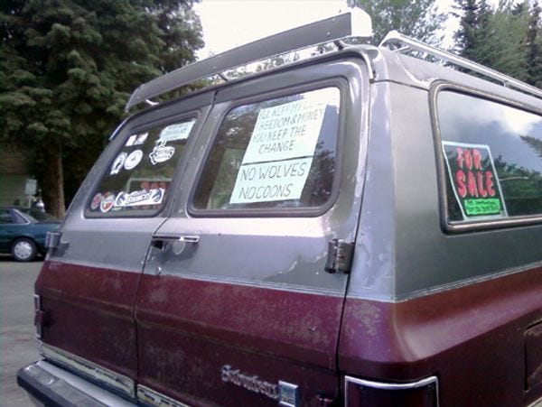 (Ha ha, we are so accustomed to outright public racism from the teabagger trash these days that we're more offended by the shitty anti-wolf window signs ... and the paint job on this piece of American garbage.)