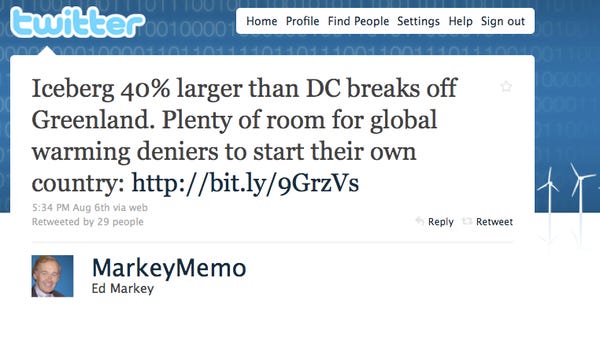 Markey is the chair of the Select Committee for Energy Independence and Global Warming, which explains his windmill-themed background and Passion for the environment. Icebergs breaking off of glaciers isn't a new phenomenon, but it's happening more regularly as the globe turns into an overheated place that can't sustain human life (we still have today, though!). Possible names for the new ice country include East Palinistan, Dumbfuck Island, and Reaganland (country motto: "The Shining Ice Chunk on an Ocean"). [ MarkeyMemo / Washington Post ]
