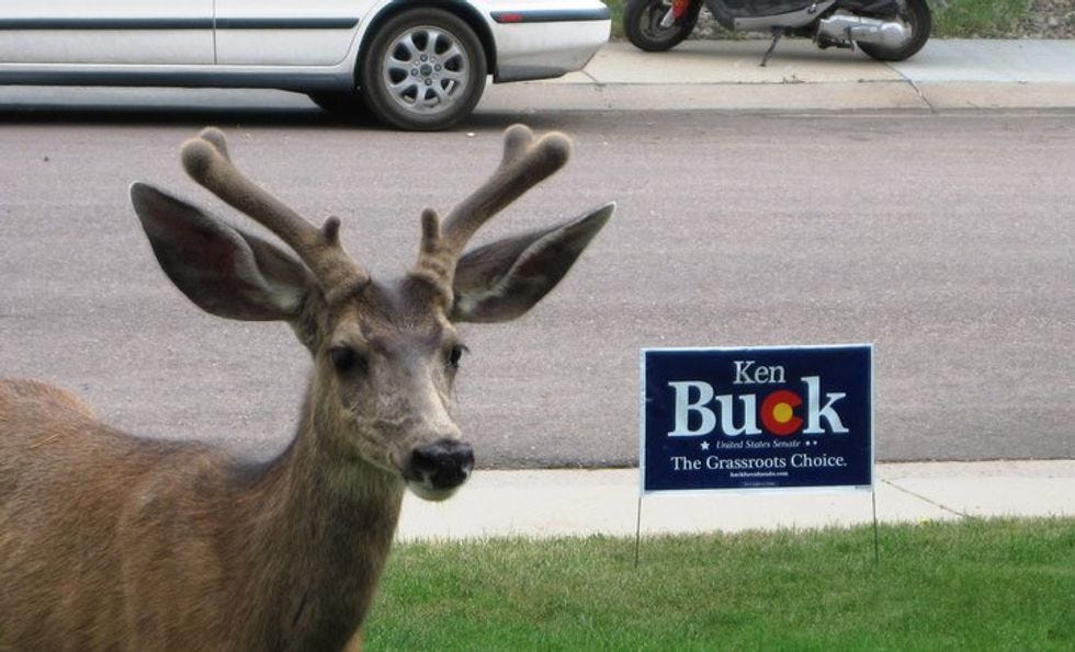 10: 38 PM — Maes appears to upload and caption his Facebook photos himself. Here is a recent photo album, with important campaign photos such as his six-year-old fishing and being hugged by a giant stuffed bear. "Hunted for 2.5 days NW of Paonia. Sara Palin has nothing on me! Can you tell it's the same guy as in that nice photo to the left? What most people who criticize hunting don't realize is that most of us do not harvest anything. We go to enjoy the absolute beauty of Colorado's back country and enjoy the blessing of living here. Back on the campaign trail." What?