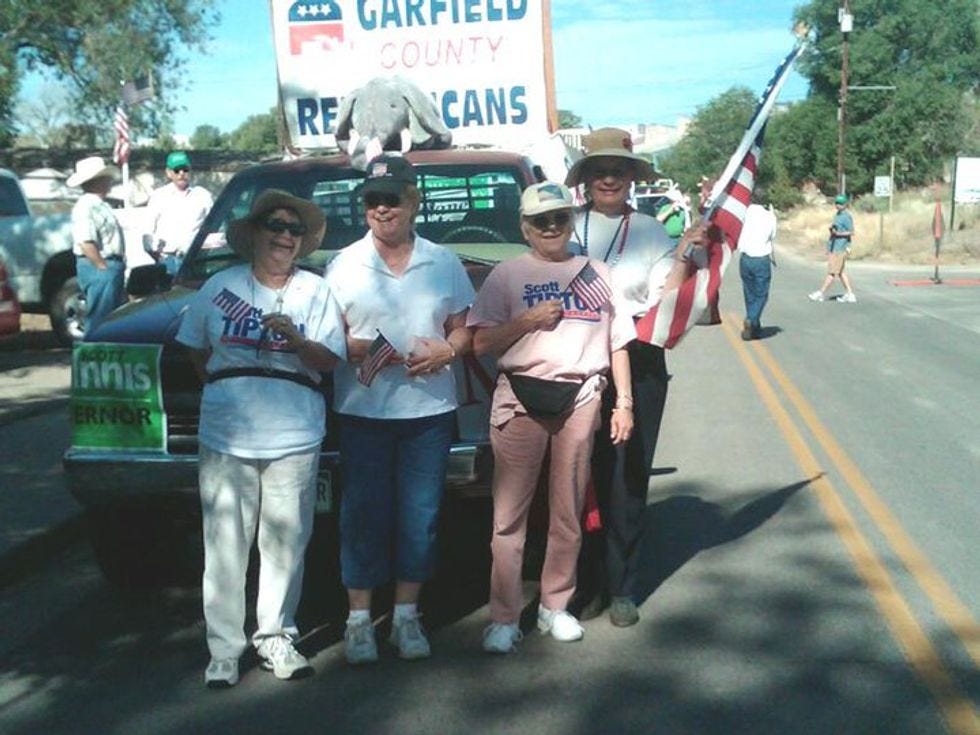 11: 42 PM — Here are some of Scott Tipton's supporters, posing with their stuffed elephant doll/life coach. Hey, didn't Michelle Obama wear a fannypack like that once? Better destroy it fast, there could be muslins inside: