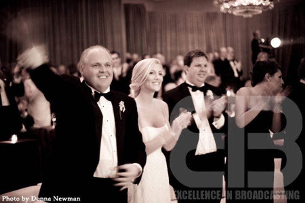 Young hearthrob Rush Limbaugh has a brand new Facebook page, and he has used this platform to at long last give the screeching masses what they want: photos of his wedding. "Sharing a laugh with Elton John backstage before his performance" is the caption on this one. Yes, somehow KNOWN HOMOSEXUAL ENEMY Sir Elton John was paid enough money to show up at this thing. Mazel tov, Rush! So what other debauchery is revealed in this photo gallery? And what did the Rush faithful have to say about these photos?