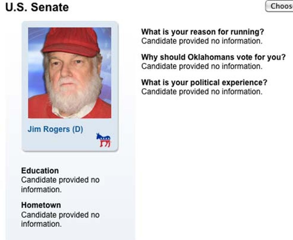 Your Wonkette takes its mandate to keep you abreast of any and all wacky political candidates seriously! So today we introduce you to your new boyfriend, assuming you like old dudes who wear baseball caps and have gross-looking beards. Jim Rogers has run for the Democratic Senate nomination in Oklahoma four times, and we all know that the fourth time is the charm, so now he is your nominee. And come November, Tom Coburn's reign of terror will be over!