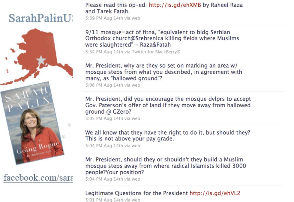 Queen Mother of Snowbillia Sarah Palin expressed her bigotry on multiple social networking platforms, going on a Twitter mini-spree: