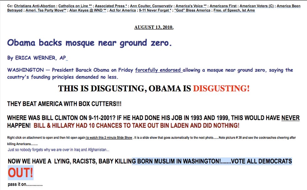 All weekend long your Wonkette received a steady stream of emails from concerned librul Americans about Cordoba House Hysteria, which is sweepin' the nation like George the Janitor is sweepin' the floor. This is because Imam Obamar came out in support of the mosque, after learning that it would be LEED-certified and also offer paintball facilities. A patriotic onslaught of tweets, Facebookery, vloggism, and bloggism about the Obamar Nazi-Satan-Allah speech followed. Let's look at some of the results -- they form a beautiful patchwork quilt of American hate-diversity.