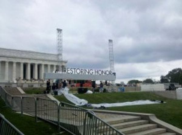 Because it's land, Washington can't just pick up and, like, hitch a Chinatown bus to New York City to escape for the weekend, do something cool like that. It has to stay right where it is, and watch all the big ol' lard babies shiftin' and jigglin' around inside their flag-festooned sweatpant-sacks, and listen to the screeches and horror sounds. Poor thing. Hope it doesn't get too PTSD'ed. [ Restoring Honor Rally Facebook page ]
