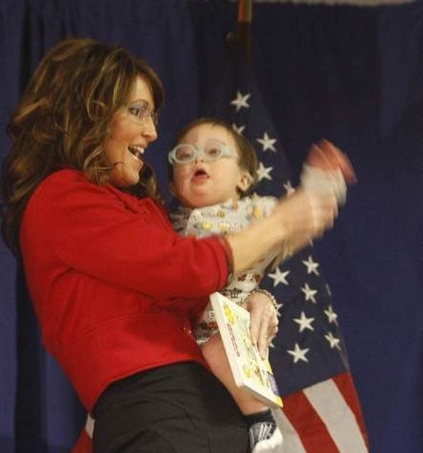 Trig Palin is a hot commodity, and when you say he's at places he's definitely not, you have to answer to Ben Smith! Ben Smith did not care for the Journalism in that Vanity Fair Sarah Palin piece, as we noted yesterday, but now he has done some digging and found out Trig wasn't even at an event the piece said he was at. It turns out the Down Syndrome baby at that event was just some random Down Syndrome baby, and not Trig, who commands a hefty $100,000-a-pop speaking rate and won't even step foot in Missouri and risk being compared to his political rival, Roy Blunt.