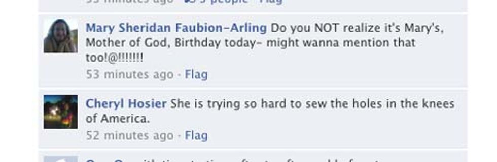 Hmmm, it looks like someone (hint: it is Mary Sheridan Faubion-Arling) has mistaken Sarah Palin for a common Papist, with this "mother of God" talk. Sarah doesn't have time for your Romish idolatry! She is too busy sewing holes in America's knees, so that ... America can pray more, we guess? Sewing holes for 600 million pant legs does seem fairly labor-intensive. Why not just have the RNC buy America fancy new pants?