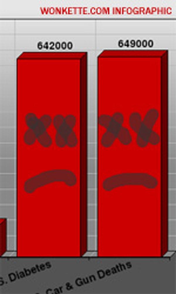 Need something to send back to all the hick-jackholes sure to send you maudlin bullshit Never Forget crying eagle gifs tomorrow? We made you a chart of math science! Methodology: We combined the 2001-2010 figures for "U.S. gun deaths" (30,000 annually) and "U.S. automobile fatalities" (379,000 over nine years) to make a second WTC tower to go alongside the U.S. Diabetes Deaths 2001-2010 of Tower One. All information was found on the Internet, using a web browser and popular sites such as the CDC and "the Wikipedia." Iraq casualties fromIraq Body Count, U.S. military deaths in Iraq and Afghanistan from iCasualties.