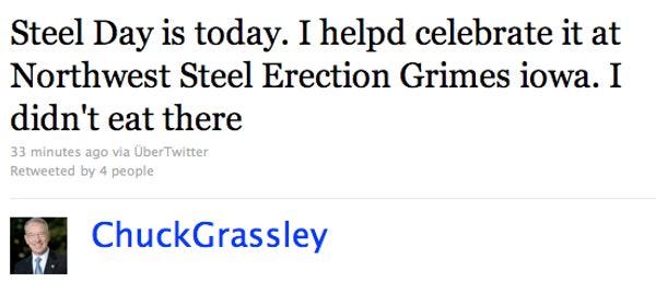 But did Chuck Grassley eat anything at this dick grime event? No, he did not. That would have ruined the sanctity of his marriage. And, more importantly, the sancitity of Twitter , which requires Grassely to do a separate tweet about what he has for lunch each day. [ Twitter ]