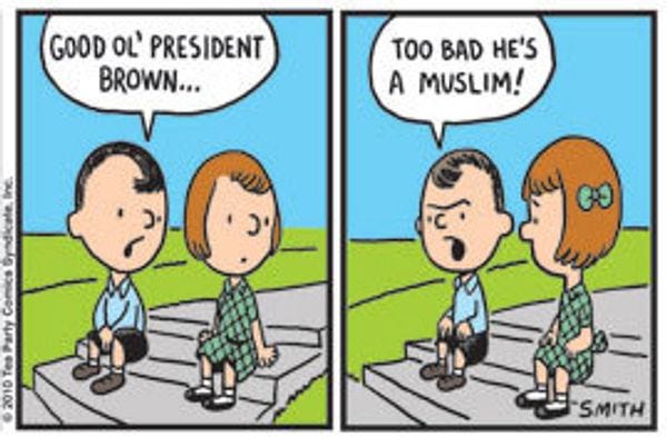 Here is a thought experiment that requires a number of unlikely assumptions. What if Tea Party people had any artistic abilities, instead of being perhaps the most artistically challenged people in History? What if lots of Americans still got a Sunday newspaper and enjoyed a collection of witty, well-drawn comics such asPeanutsandCalvin & HobbesandThe Far Side? And what if, somehow, the Tea Party people took over the comics syndicates and filled America's beloved Sunday Funnies with a bunch of ham-handed racist troglodyte fringe-right idiot nonsense?