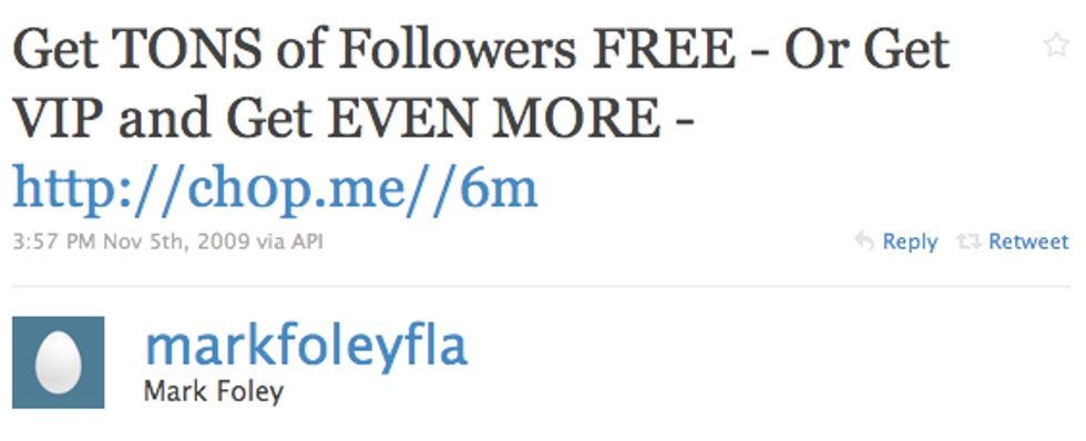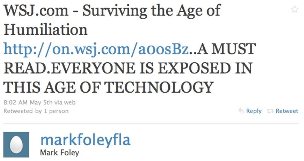 Wow. Congressional-page connoisseur Mark Foley is on Twitter. Is he legally allowed to do that? Who knows, but it turns out Foley has been on Twitter since March. He only has 181 followers right now, despite being rather infamous. When he joined, did he have to alert his new Twitter neighbors he's gotten in trouble with the law before for messaging underage boys on the Internet? That joke is actually a legitimate question, because Mark Foley is "following" a half-naked 15-year-old boy on Twitter right now. We are completely serious.