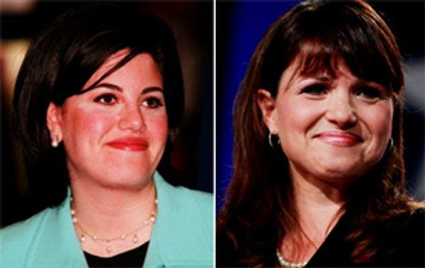 Why do today's teabagger sweethearts all look like infamous White House intern Monica Lewinksy? Could it be that the fetching Oval Office paramour of Bill Clinton had some deep, weird effect on right-wing men in this country? Was all that posturing and yelping andgoing insaneover a politician having a tacky affair really about something much weirder? Did Lewinsky hit some special button in the impotent nether regions of America's wingnuts? And why does Christine O'Donnell lookexactlylike Monica in her heyday? It would be sexist to even raise this subject, but our pal Rebecca Dana already did it for Tina Brown's Internet Tendency, so it has automatically transubstantiated from filth to scholarship! (This is witchcraft.)
