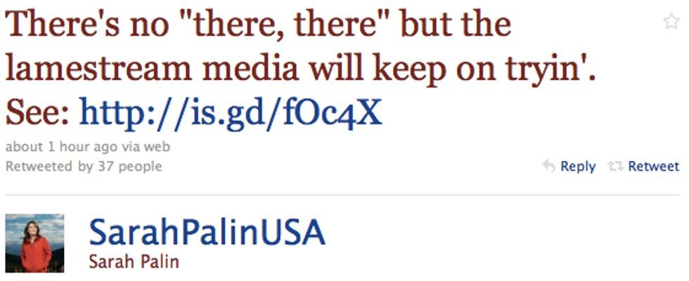 Does she mean "There's no there there"? Isn't "there, there" an old thing to say to comfort a sad child or puppy? Whatever. If a Palin says it, it must be true. [ Weekly Standard / Twitter ]