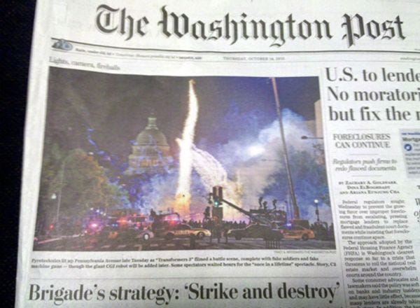 This is the same kind of can-do "give us a couple hundred billion dollars and we'll get the job done" Army strategy recently used in Iraq and Afghanistan. But ever since teevee dildo Pat Sajak said U.S. soldiers cannot vote in American elections, we all knew the Army would eventually turn its massive firepower upon our own U.S. Capitol. Oh well. [ Washington Post via home subscriber "Richard H."]