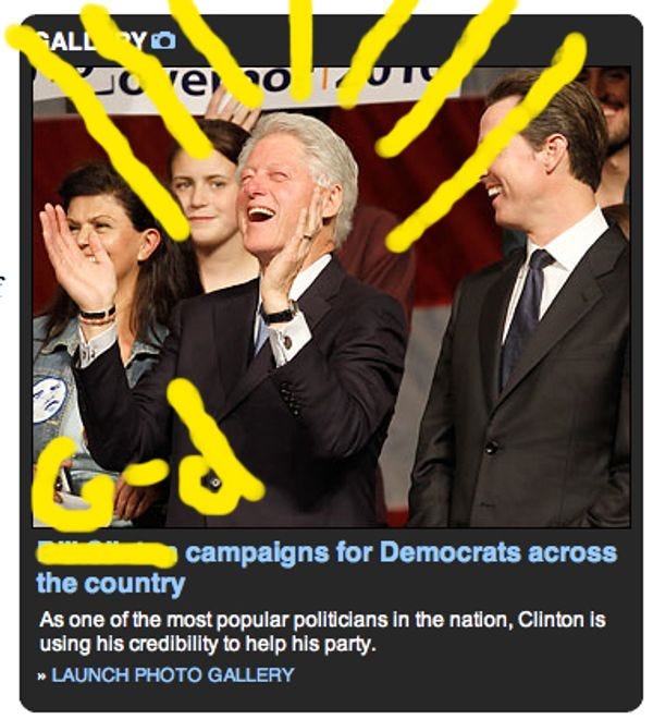 Oh, fiddlesticks, what have the Democrats gotten themselves into this time ? That's okay, Bill Clinton will squiggle out of the seaweed cocoon he keeps himself in and come to save them. Did anyone ask him to do this? Well, no, apparently Bill Clinton will just call you up and let you know he is here to rescue you and will show up to have a huge rally with you. Bill Clinton, you see, has a lot of ideas about what the Democratic Party's message should be, and he's going to tell it to the people of this country because he is convinced they all want to have sex with him. It's funny, though, that so many of his chosen candidates lose! Such as his wife, in his last major campaign push! Or, soon, Kendrick Meek, for whom Clinton has appeared "more than a half-dozen" times. Or, say, Gavin Newsom, who is pictured next to Clinton for this article as the old president does his best "I feel so good being your God!" pose.