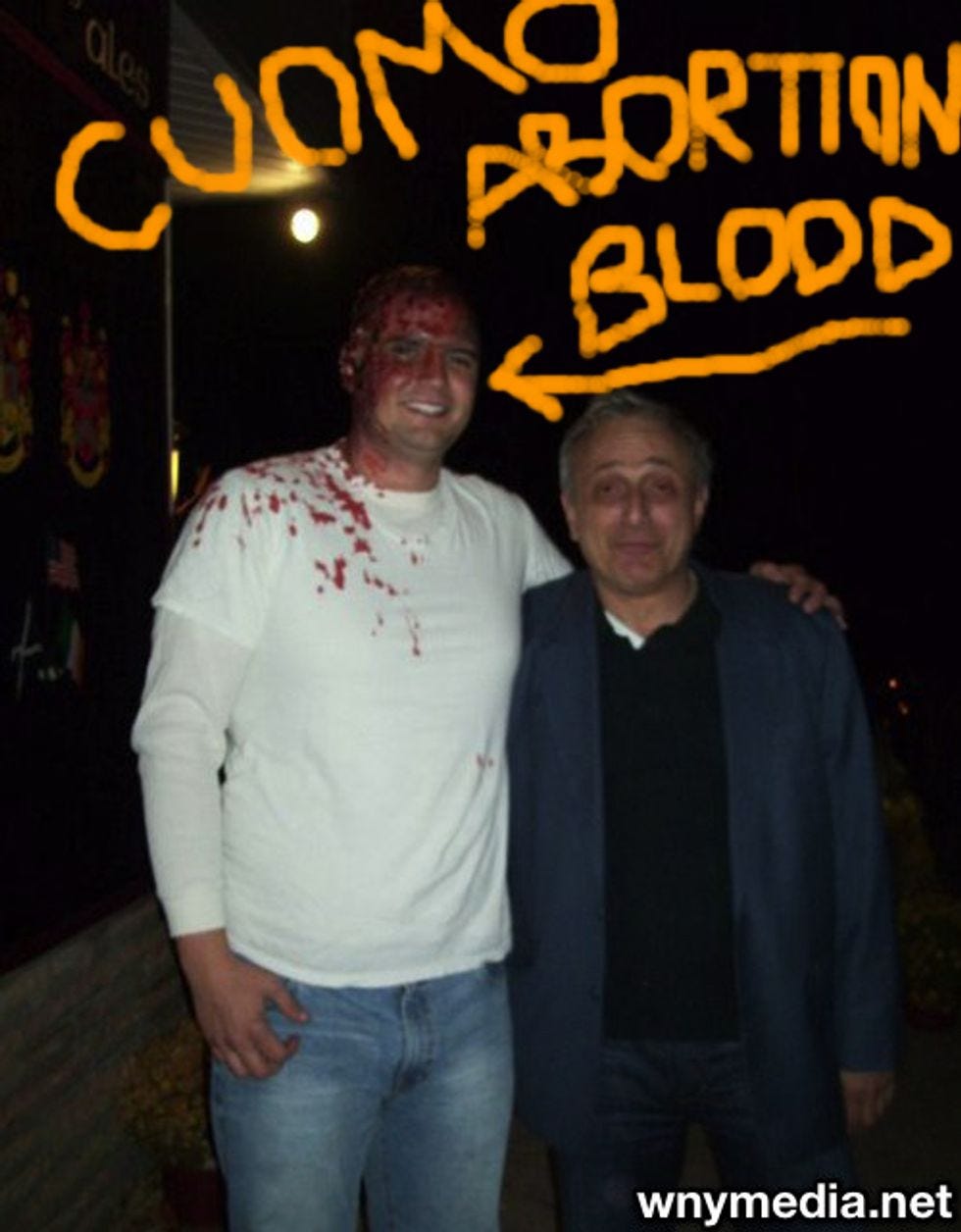 Who is this mysterious man next to the guy with the shoe-polish face? No, it is not a "good Carl Paladino costume," it is the man himself, doing what every candidate should do mere hours before his gubernatorial election: get drunk at the local bar and grope some young women in "sexy Mrs. Buttersworth" costumes. So if you live in the Buffalo area, Paladino likely photobombed all of your Facebook pics from last night. But that's okay, because it turns out he has some very good drunk faces that will enliven any Halloween photo.