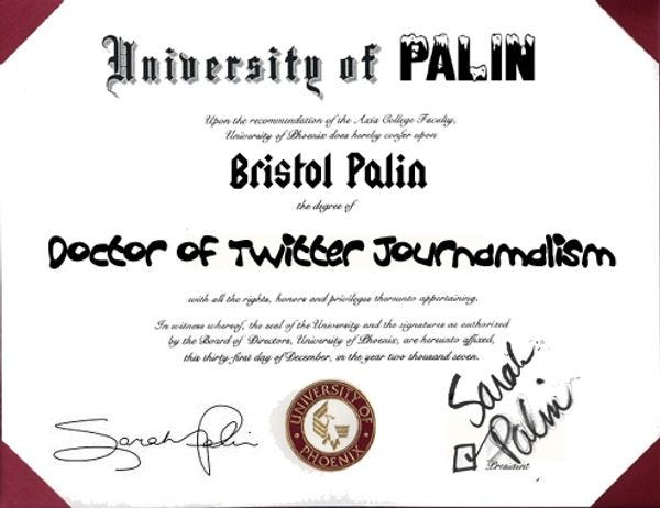 Responding to the mean ol' Politico which is supposed to just repeat whatever the Tea Party nuts say, Palin told her Scientologist co-worker at Fox News that it's time everybody went to the University of Palin to earn their online degree in journamalism:
