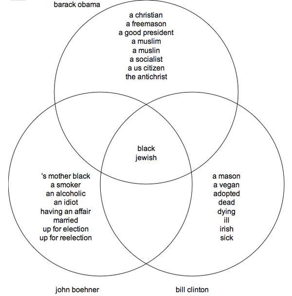 Barack Obama and John Boehner are going to have to work with one another if they want to get any sort of legislation passed in the next two years. The problem is that one of those two people probably wants to get stuff passed, but that second guy would rather get drunk on the reg and cover himself in orange paint on the reg. The New York Times asked some people around Washington if these two guys will ever hang out and get things done like Tip O'Neill and Ronald Reagan or Newt Gingrich and Bill Clinton did, and everyone basically said no. But with the power of the Internet, we made the Venn diagram above, based on Google Suggest data. According to search-engine users, Barack Obama, John Boehner, and Bill Clinton are black and Jewish. So at least they have that in common!