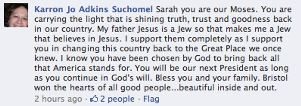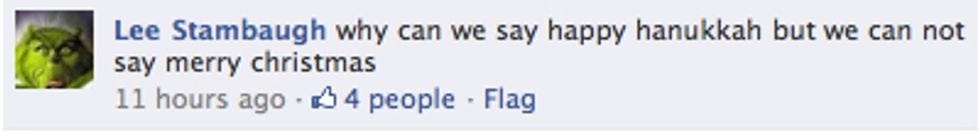 Sarah Palin has wished all American Jews a happy Hanukkah on Facebook, because all good Christians know being nice to Jews, despite them being wrong about Jesus , is how you earn special been-nice-to-Jews coupons you can spend in heaven. Most commenters understand this and tried to one-up one another with stories of how they honor this important (unimportant) Jew holiday. One was even kind enough to remind Palin of the fact that she is literally the modern-day Moses. But others weren't too happy about all of this, because one is supposed to say "Merry Christmas" and nothing else ever. Let's take a look at some of these festive comments.