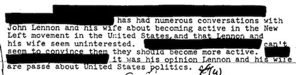 With Lennon in the United States, as these many gross pages of documents proudly displayed on the FBI website can attest, the interest was far more political. For years and years, during the long awful decline of the 1970s, many U.S. government employees trusted to uphold the Constitution and provide justice to Americans instead wasted their time (and our tax dollars) idiotically tracking the banal movements and thoughts of a guitar player who rarely left his apartment. Because OMG, what if hemeantRevolution, for real?!?! What if the millionaire in Central Park West suddenly called up a guerrilla army of freaks to ... we don't know, ruin America in some way that differed from the way Washington (then and today) intentionally ruined America.