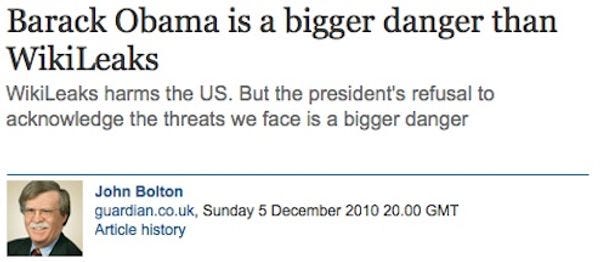 John Bolton, the wingnut who only wanted to bomb Iran for Jeebus and then shut down the UN, while he was a UN ambassador, figures therealproblem is that Barack Obama is not doing enough wars against certain countries (Iran). So it stands to reason that Obama is just letting these Wikis leak all over the place, when he should be prosecuting the Global Internet the same way Sarah Palin sued Gawker for publicizing her book for free:
